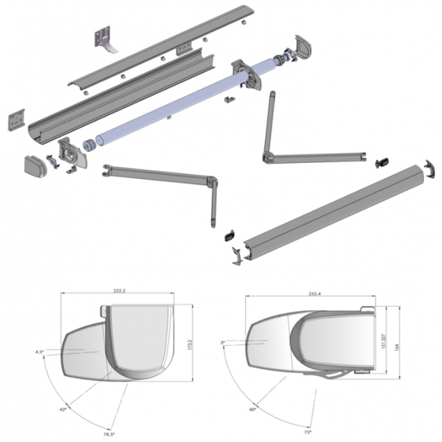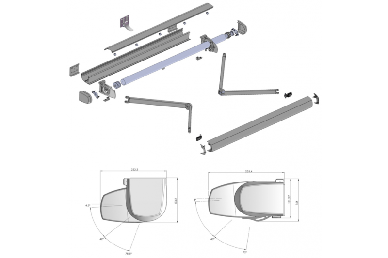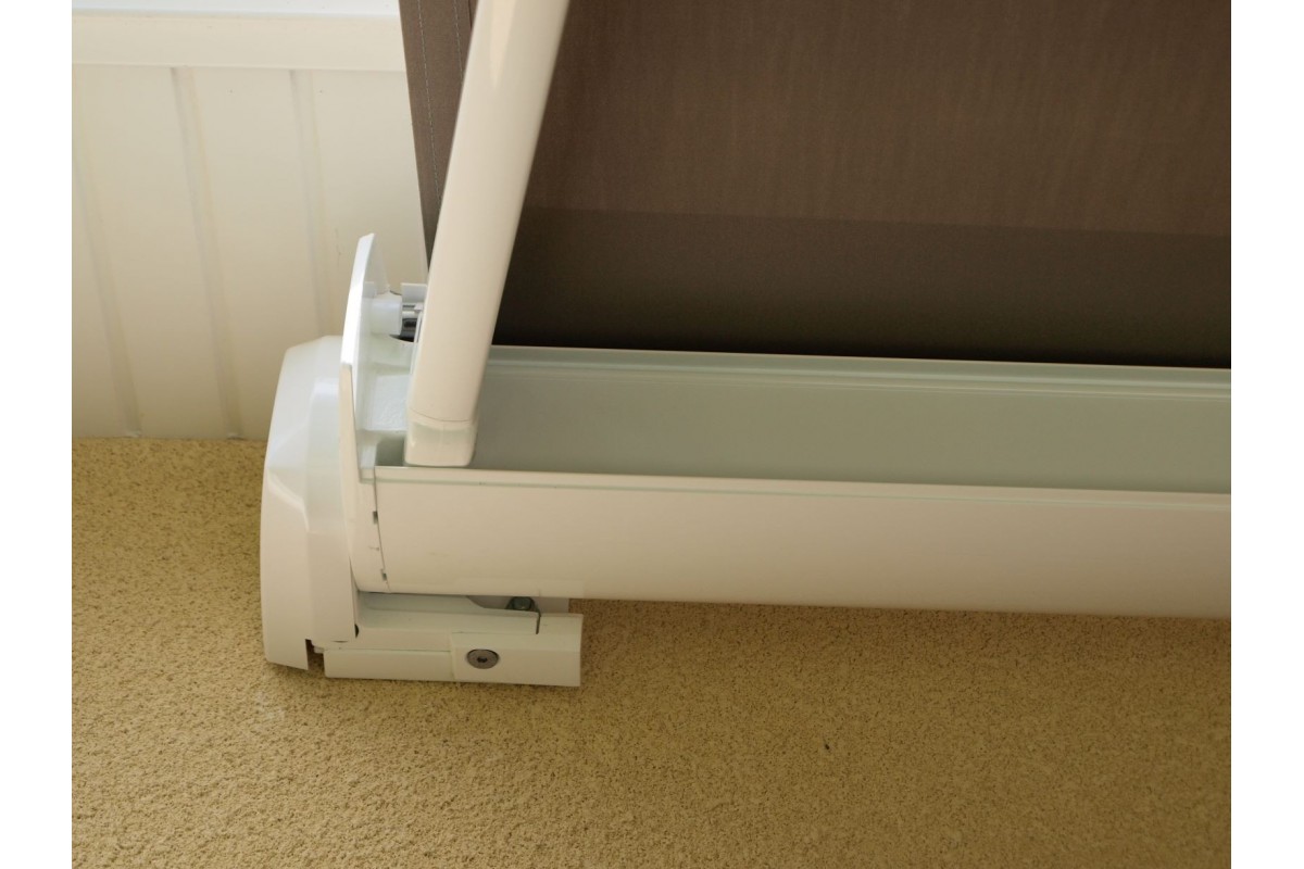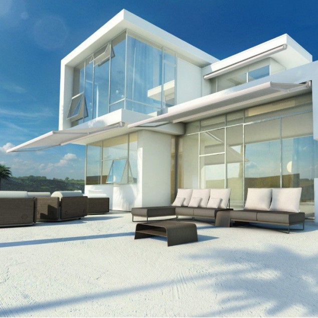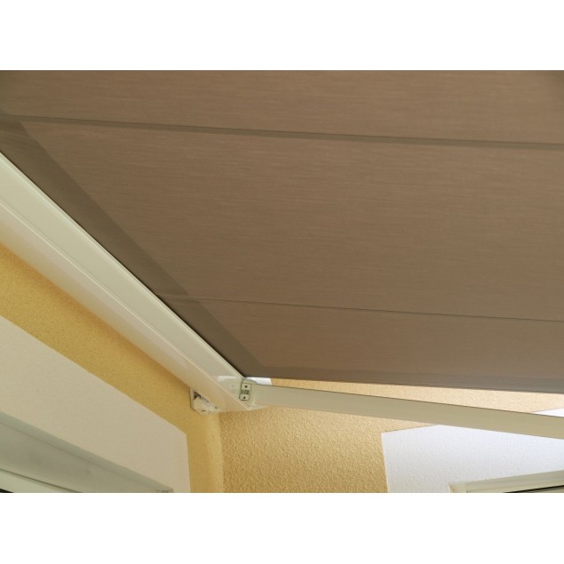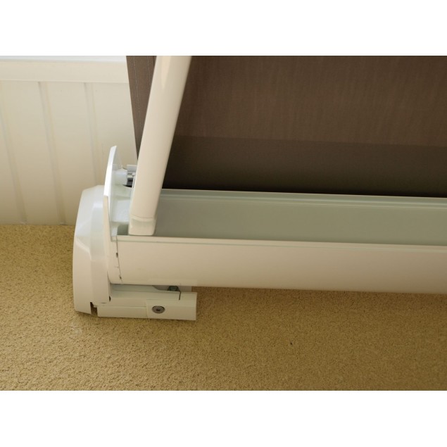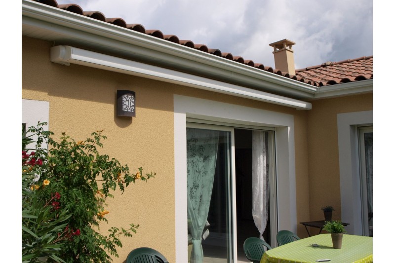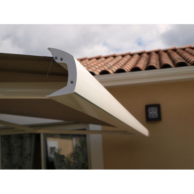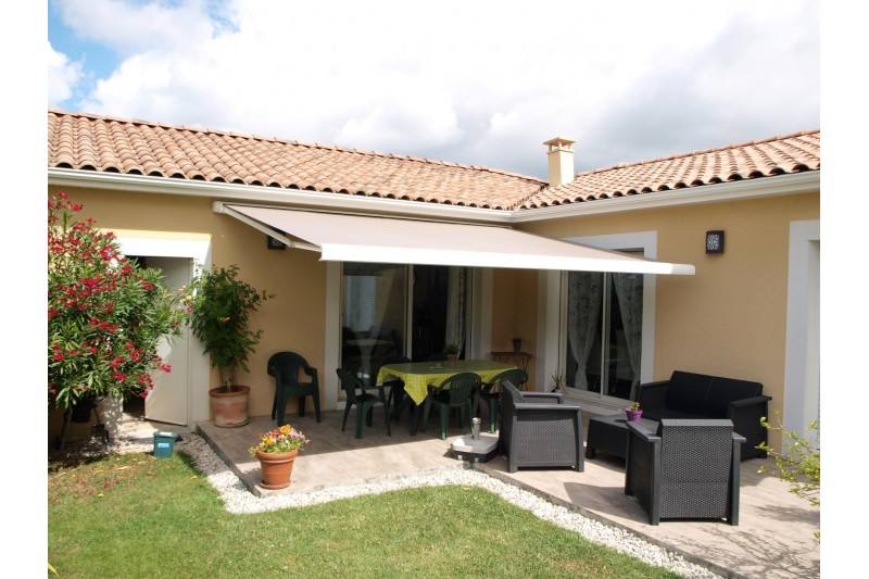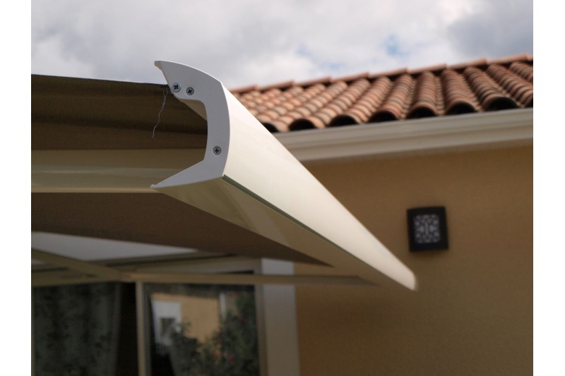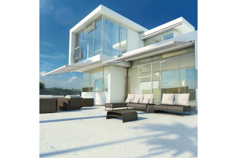 Store coffre complet Simon, particulièrement conçu pour des lignes grandes et pouvant couvrir des espaces jusqu’à 21m2. Protection du mécanisme et de la toile lorsque le store est replié. Store banne coffre aux lignes discrètes.